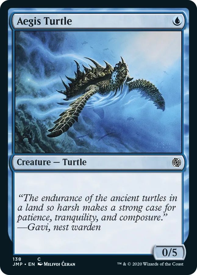Aegis Turtle is our beat stick. It’s worth noting he wasn’t my first choice. I searched tirelessly for a 0/4 for 1U with no other text (aka a vanilla creature). Im not saying it doesn’t exist. Just that I couldn’t find a perfect one. Weight Advantage also wasn’t my first choice for an ability to deal damage based on power, but it was the cleanest, most simple option. Both players begin with Weight Advantage in play (or just have a picture of it handy as a reference).